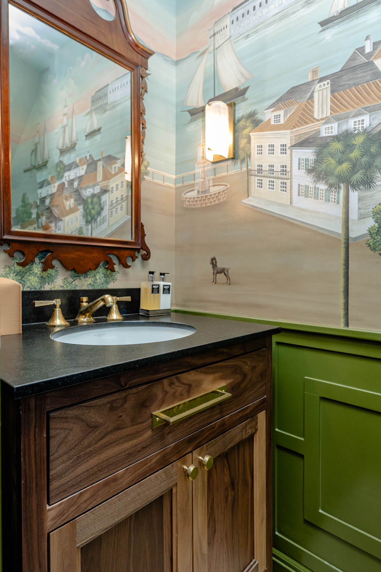 Perched above Charleston’s iconic King Street, this transitional penthouse kitchen designed by Erika Frizol embodies luxurious sophistication through impeccable craftsmanship and refined material selections. The space features locally-made custom inset cabinetry with a distinctive painted finish, complemented by unlacquered brass hardware that will develop a rich patina over time. The kitchen’s centerpiece is a striking one-piece island that creates a seamless, sculptural presence in the space. Paneled built-in appliances disappear into the cabinetry for a clean, integrated look, while the thoughtfully designed pantry incorporates a built-in icemaker, convenient trash pull-out, and elegant pocket doors that maximize accessibility without compromising the streamlined aesthetic. The design extends beyond the kitchen, with the bathrooms showcasing natural inset walnut cabinetry that introduces organic warmth throughout the penthouse.